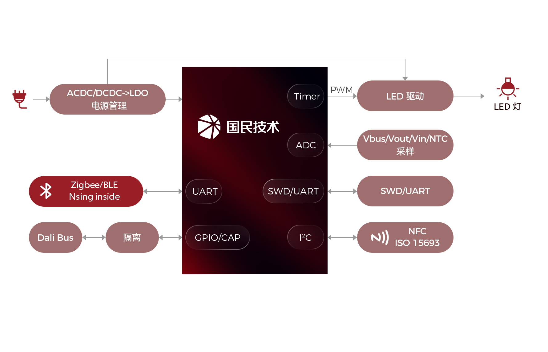 DALI(Digital Addressable Lighting Interface)电源主芯片采用32-bit Arm® Cortex®-M4F内核,最高工作主频72MHz,支持浮点运算和DSP 指令,集成高达64KB 嵌入式加密Flash,8KB SRAM,集成丰富的高性能模拟器件,内置1个12bit 4.7Msps ADC,3个高速比较器,集成4个U(S)ART、2个I2C、2个SPI/I2S 等数字通信接口。