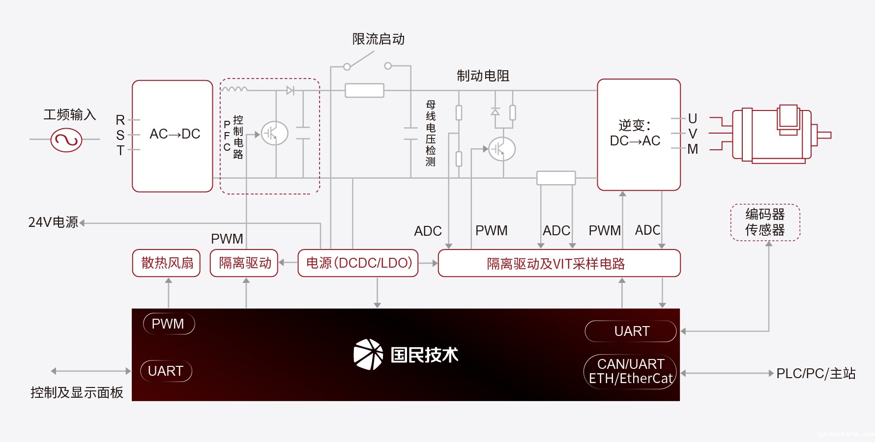 变频器内置简易PLC与PID控制,支持矢量控制模式和V/F控制模式,具有多段速度控制功能,载波频可调。N32H系列高性能MCU芯片在方案中主要实现人机UI交互、电机控制、ADC多路模拟量采集、SPI Flash读写、片内Flash加密存储以及读写保护等功能。