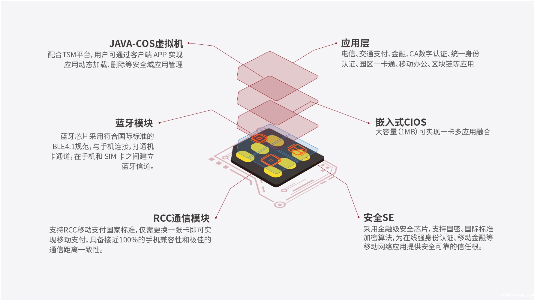 基于RCC近距物联技术的高安全RCC蓝牙SIM卡产品采用先进的SiP技术,将支持商密算法的金融级安全芯片、RCC芯片、蓝牙芯片封装进一张NanoSIM卡中,可以融合电信、金融支付、安全认证等多种应用,可跨手机操作系统实现线上、线下的移动安全认证和近距物联应用。产品算法支持全面,采用JAVA架构,实现应用多样化,提供成熟的开发套件,易于用户实现二次开发。