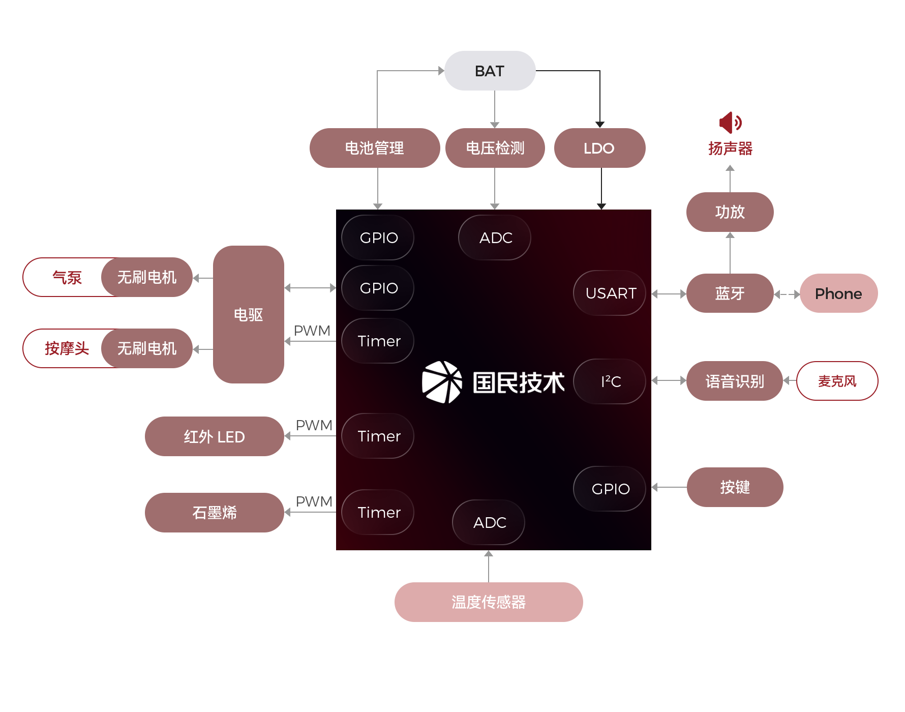 • 内置多路定时器,支持多路PWM输出,满足电驱、红外LED、石墨烯加热等功能需求