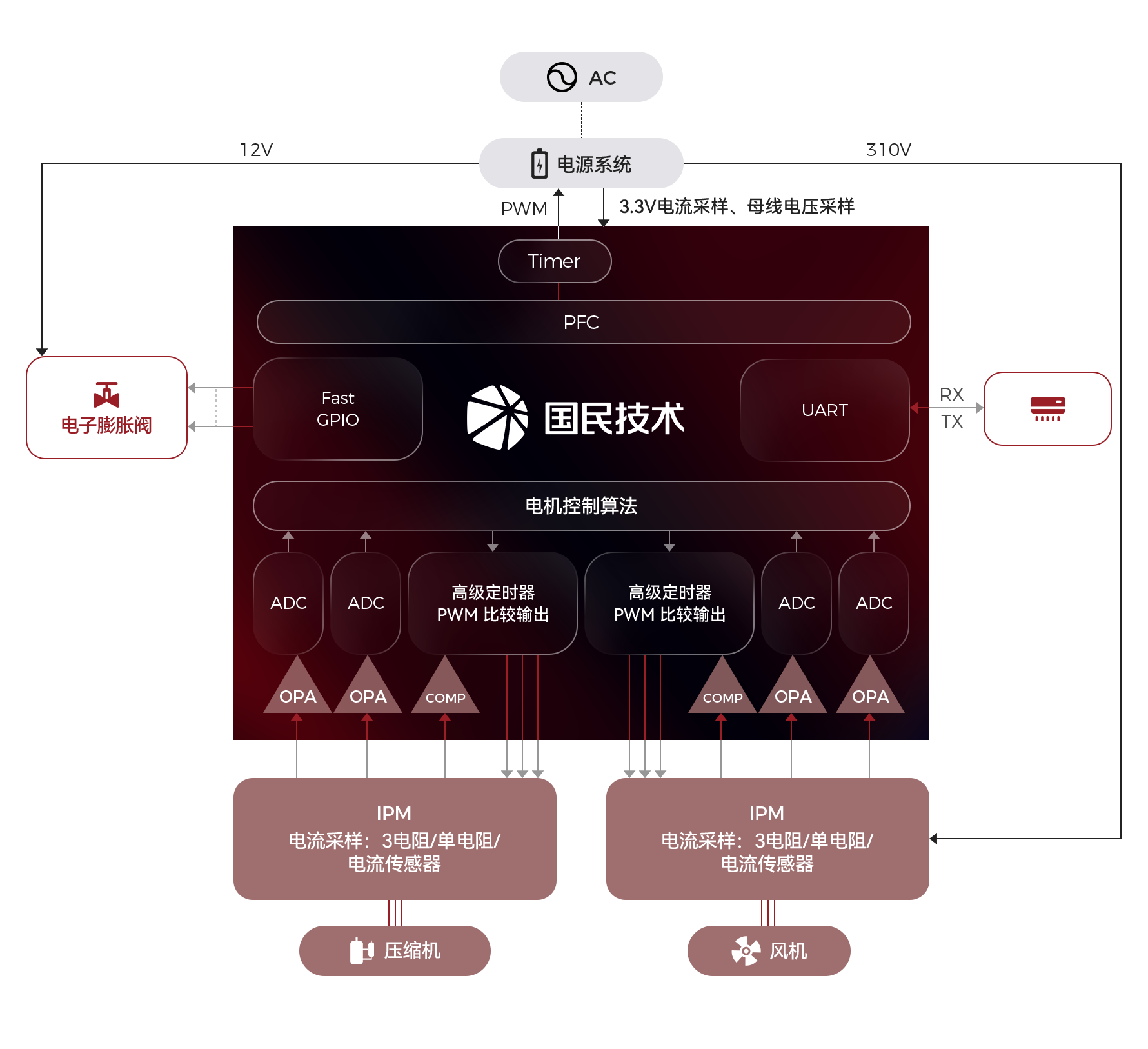 • 高集成度:单MCU实现风机、压缩机的FOC控制