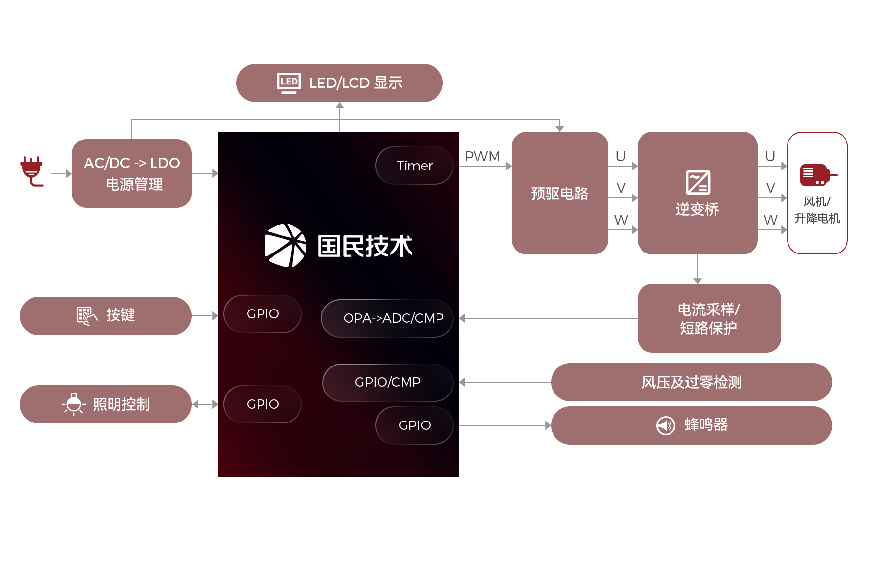 油烟机采用无感FOC控制算法,支持恒转速、恒转矩、恒功率等多种控制模式,可在运行过程中实现多种工况实时切换;支持主控面板和电机控制板之间的双向通信,可快速完成整机方案切换;支持OTA功能;支持电感、电阻离线辨识;支持过欠压、堵转、缺相、过流等完善的故障保护。