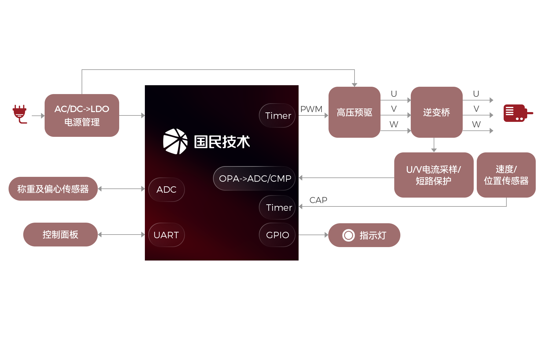 洗衣机应用采用先进的无位置传感器FOC控制策略,N32G435系列采用32 bit Arm® Cortex®-M4F内核,最高工作主频108MHz,支持浮点运算和DSP指令,集成高达128KB嵌入式加密Flash,32KB SRAM,集成丰富的高性能模拟器件,内置1个12bit 5Msps ADC,2路独立轨到轨运算放大器,2个高速比较器,1个1Msps 12bit DAC,集成多路U(S)ART、I2C、SPI等数字通信接口,内置多种密码算法硬件加速引擎。