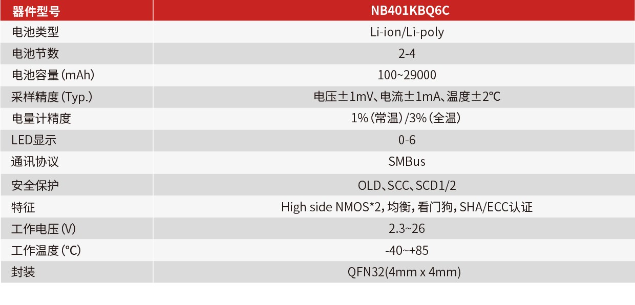NB401是一款应用于pack侧的集成高精度电量计算法的电池管理芯片,支持2/3/4串锂离子电池或锂聚合物电池管理,具有监控、保护、计量等功能。芯片集成2个16位ADC分别用于采集电压(或温度)和电流,同时集成硬件保护和唤醒功能,支持SMBus通讯、智能充电管理,以及多种加密认证,且具有超低功耗,可以满足绝大多数电池保护或计量应用需求。