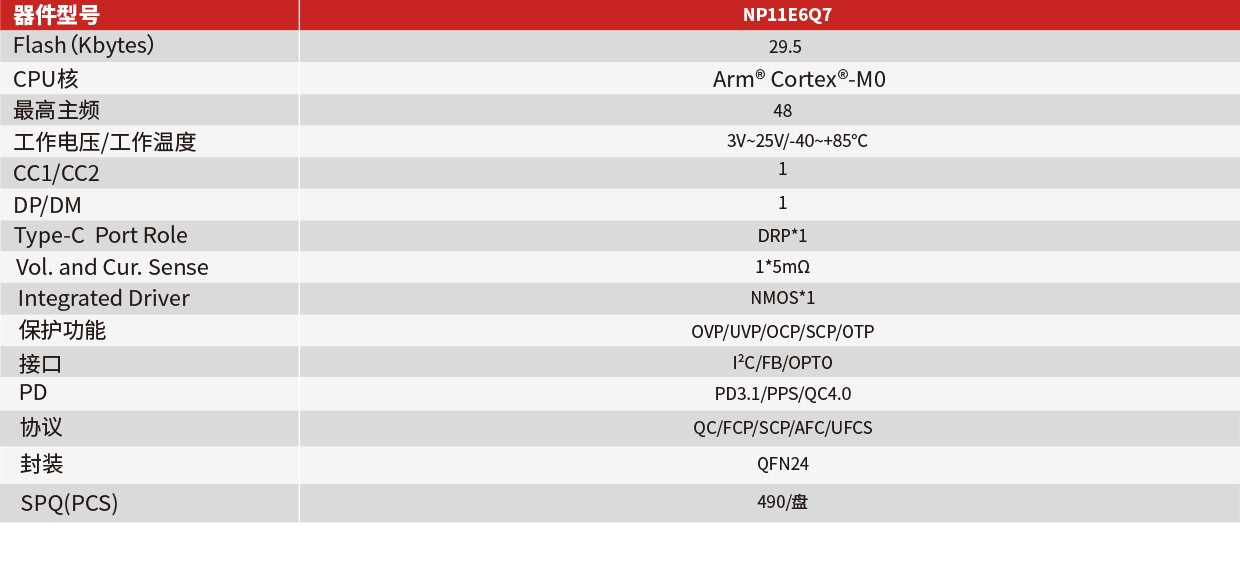 NP11是一款高集成度高性价比的USB Type-C PD 或Type-A单口快充协议芯片,内置高性能处理器和可编程Flash存储器。芯片内部集成了CC/CV 控制环路、双边泄放电路以及多种系统保护功能。芯片采用高度集成的设计,外部元器件少,为适配器、车载充电器等提供高集成、低成本的完整解决方案。
