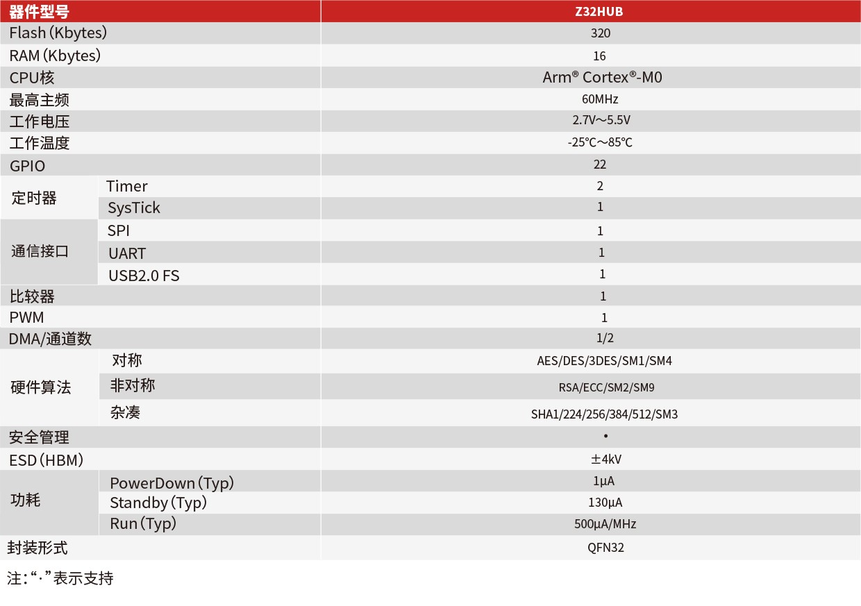 Z32HUB是一款带有硬件USB2.0 Full Speed的高性能32位USB KEY安全芯片,带有1路SPI主接口、1路UART接口、特别定制化耳机接口和丰富的GPIO。集成了32位Arm® Cortex®-M0高性能安全核、16KB核外RAM和320KB内置Flash,芯片内置SM1/SM3/SM4算法运算单元、带3KB专用RAM的64位公钥密码引擎(ECC/SM2/RSA1024/RSA2048)、DES/3DES算法运算单元、AES算法运算单元、SHA1/SHA256/SHA384/SHA512算法运算单元和真随机数发生电路。芯片通过EAL4+安全认证。