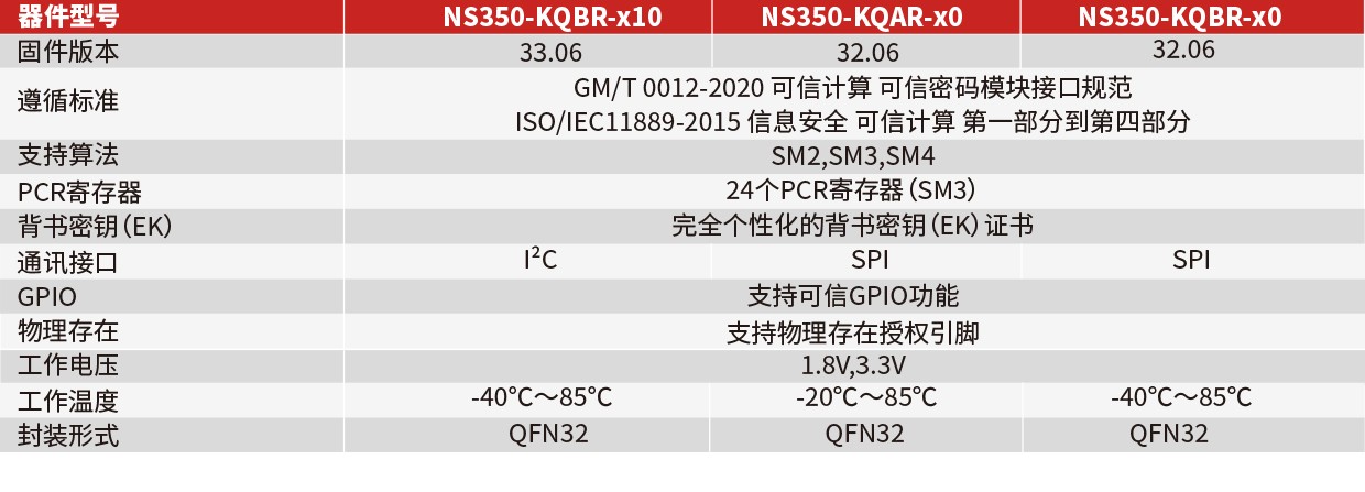 NS350 v32/v33系列产品是必威betway官网下载新一代高安全性、高性能且超值的可信密码模块2.0(TCM 2.0)安全芯片。NS350芯片基于40nm工艺设计,在技术性能和安全性方面均有较大提升。芯片支持I2C和SPI接口,提供QFN32、QFN16等封装形式,符合我国新一代TCM 2.0可信密码模块标准要求,同时兼容TPM 2.0国际可信计算标准应用(TPM 2.0 Spec 1.59)。芯片支持多路设备的主动度量功能(杂凑和签名验证),可兼容通用Windows、Linux、BSD UNIX等操作系统,以及银河麒麟、统信、方德、神州网信政府版Windows等国产操作系统,适用于PC、服务器平台和嵌入式系统。芯片通过国际CC EAL4+安全认证。
